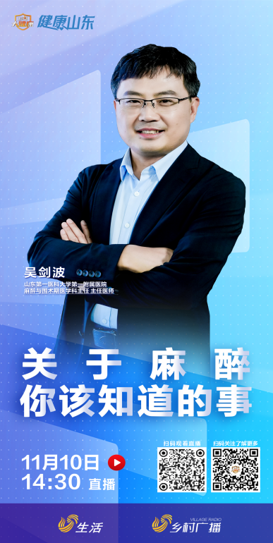 11月10日,麻醉与围术期医学科主任、主任医师吴剑波教授受邀参加了由山东广播电视台主办的《健康山东》大型健康科普直播节目。