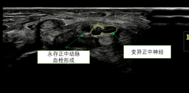 ▲术前超声显示:永存正中动脉血栓形成,正中神经变异