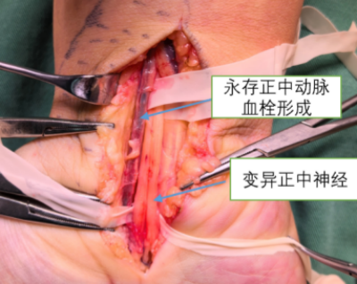 正常情况下,胎儿时期的前臂正中动脉会在出生前逐渐退化。然而,研究显示,约0.95%—5.00%的成年人该动脉并未退化,称为“永存正中动脉”。该动脉走行于腕管内,若因急性损伤、过度使用或凝血功能异常等原因发生血栓,可急剧升高腕管内压力,压迫正中神经,引发急性重症腕管综合征。对于此类病例,保守治疗通常无效,需及时行开放式腕管松解术并切除血栓性动脉,以挽救神经功能。