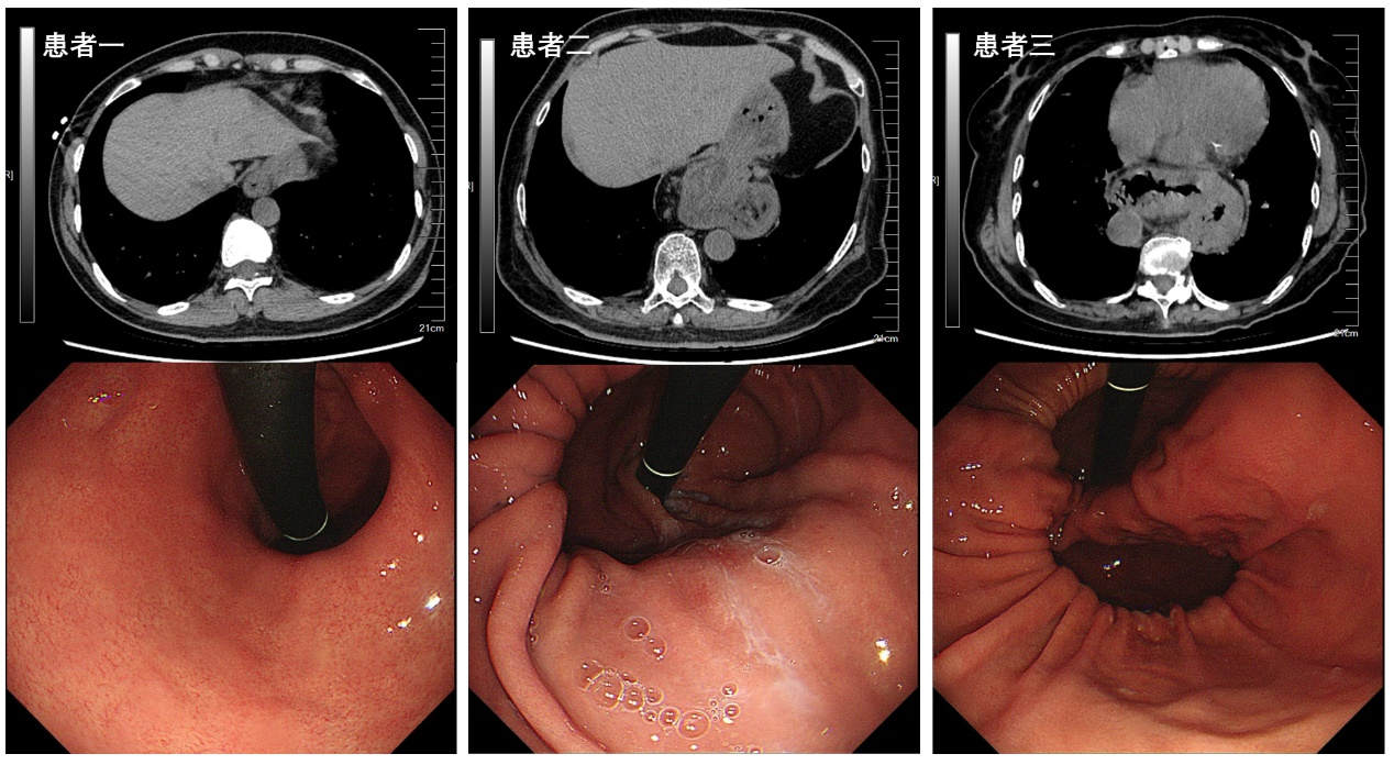 ▲食管裂孔疝患者CT及胃镜表现
