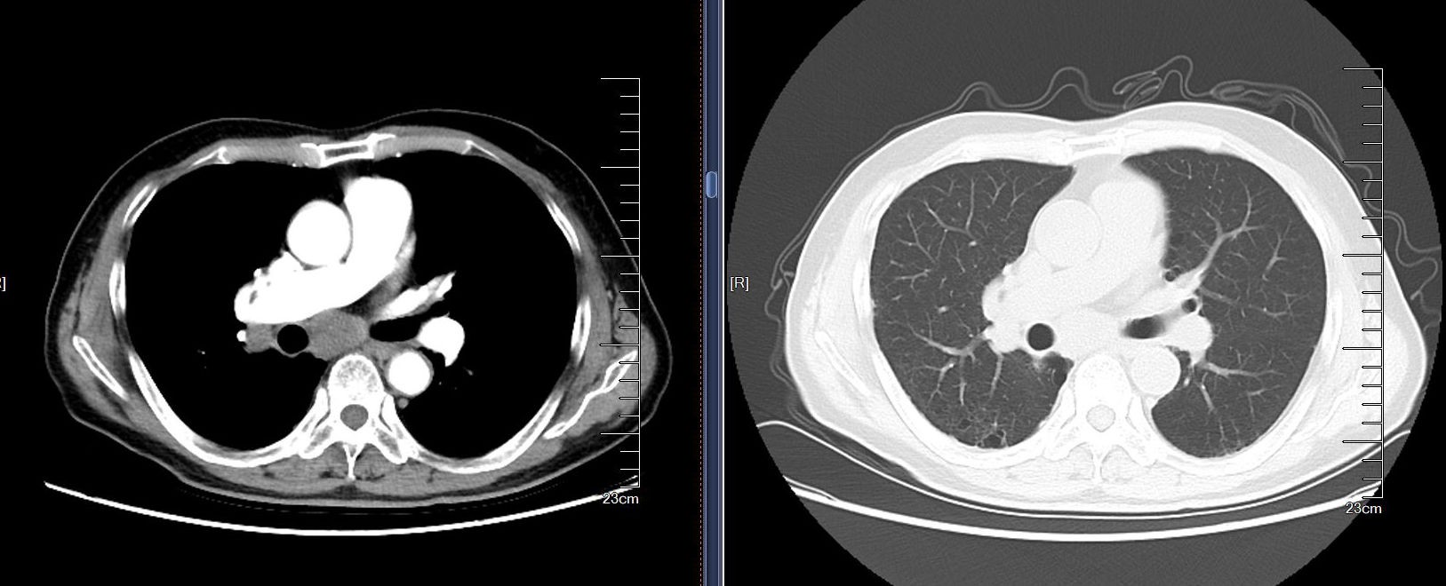 图1:患者胸部CT提示纵隔淋巴结多发异常肿大