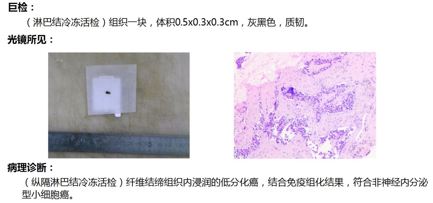 科室介入团队经过术前充分评估,决定采用EBUS-TBMC技术。麻醉科全麻并植入喉罩,在鲁德玕主任医师的指导下,胡海洋副主任医师和高明霞主管护师连贯流畅地完成选点、开孔、超声小探头评估及冷冻活检,全部操作过程仅用时约10分钟(图2-3)。冷冻活检获取的组织标本饱满、结构完整,病理报告:小细胞肺癌(图4-5)。