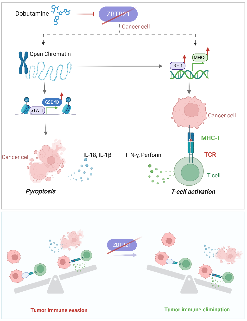 本研究的关键突破在于,找到了一个能够同时调控这两个关键环节的“控制器”——转录因子ZBTB21。研究发现,ZBTB21通过表观遗传机制(调控H3K27ac组蛋白修饰)“锁闭”了焦亡关键执行蛋白GSDMD的基因区域,使其无法被激活信号(如STAT1)有效开启,从而抑制了焦亡的发生,维持了肿瘤的“冷”状态。同时,ZBTB21通过类似机制抑制了另一个关键转录因子IRF1的表达和功能,而IRF1是启动MHC-I分子表达的核心开关。ZBTB21的活跃导致肿瘤细胞表面MHC-I水平低下,实现了“免疫隐身”。