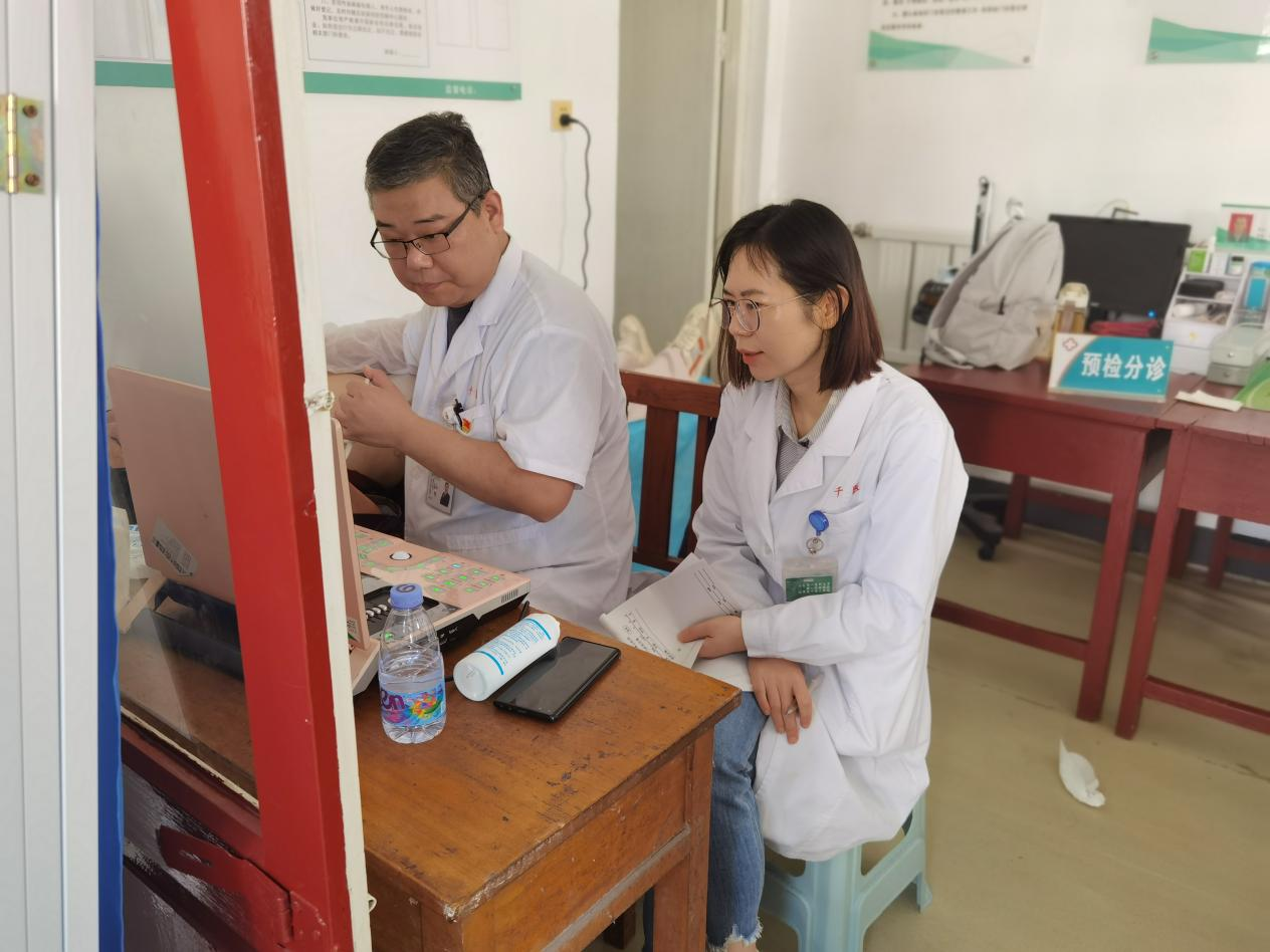 在超声诊疗区域,超声诊疗科专家联合乳腺、甲状腺外科医师,为30余名村民进行乳腺甲状腺的超声检查。现场就为7例高危病例患者进行联合评估,并给出诊疗建议。他们还为村民留下联系方式,便于后续复诊与随访。