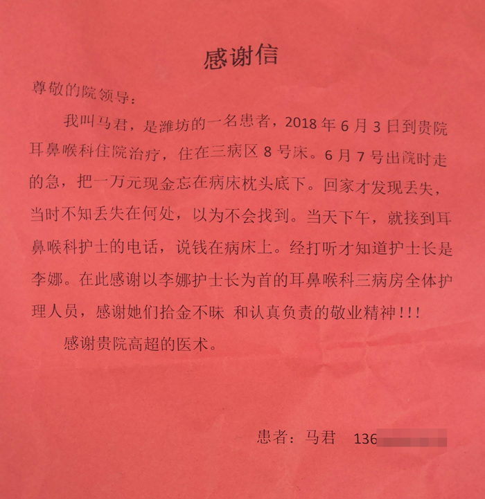人文医院起表率 拾金不昧显情操——致耳鼻喉科 2018-06-22 15:10 尊敬的院领导: 我叫马君,是潍坊的一名患者,2018年6月3日到贵院耳鼻喉科住院治疗,住在三病区8床。6月7号出院时走得急,把一万元现金忘在病床枕头底下。回家才发现丢失,当时不知丢在何处,以为不会找到。当天下午,就接到耳鼻喉科护士的电话,说钱在床上,经打听才知道护士长是李娜。在次感谢以李娜护士长为首的三病房全体护理人员,感谢她们拾金不昧和认真负责的敬业精神!!! 感谢贵院高超的技术。 患者:马君